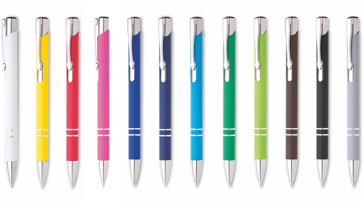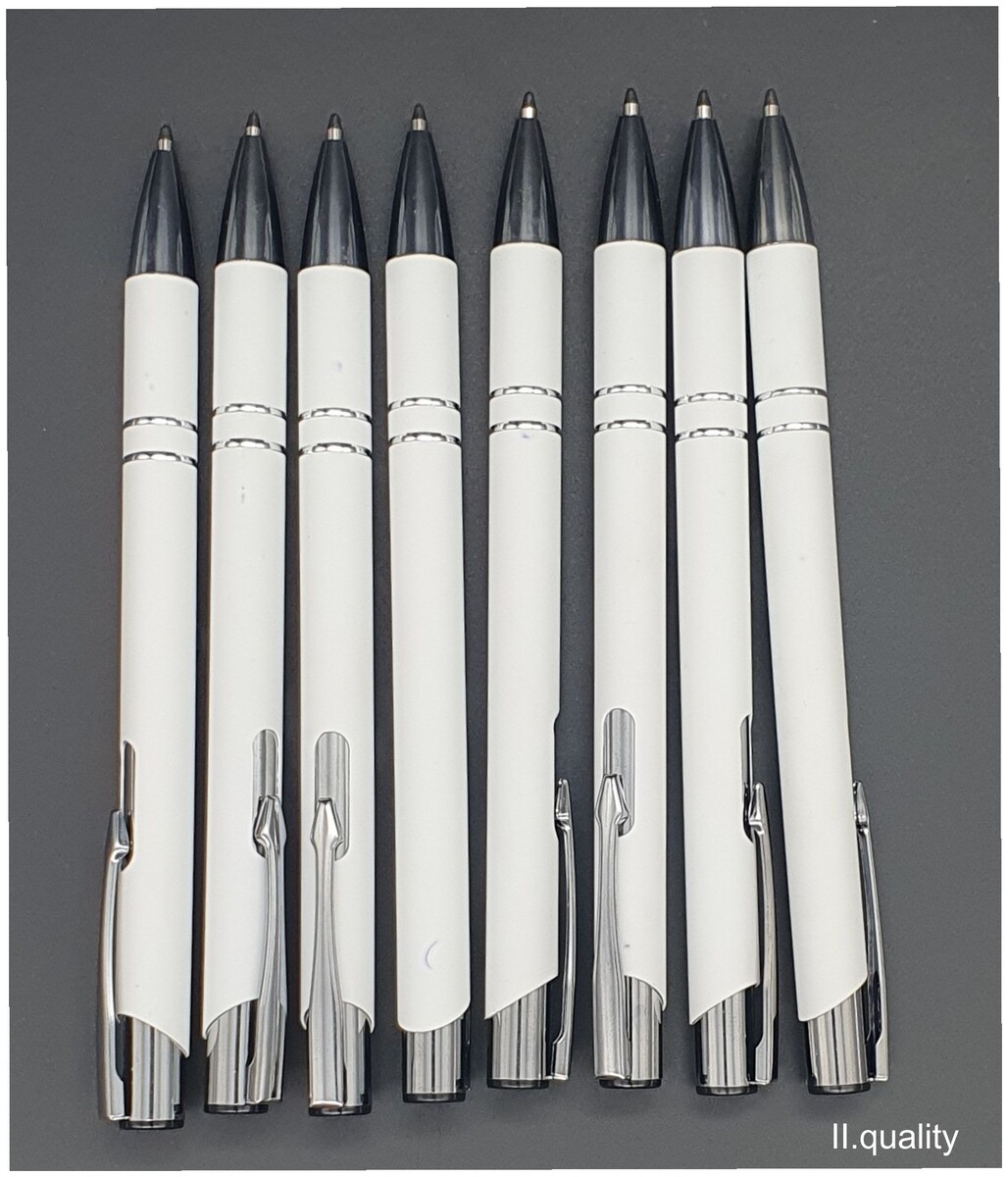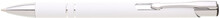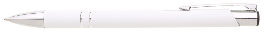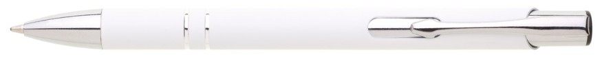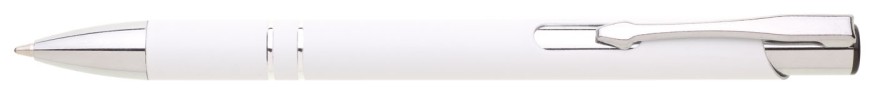 Hliníková propiska se stříbrnými doplňky a měkkým pogumovaným soft povrchem v bílé barvě. Modře píšící.