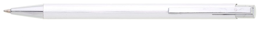 Stříbrná kovová propiska s jemně rýhovaným povrchem.