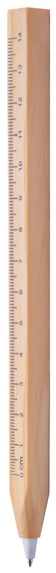 Dřevěné kuličkové pero se čtvercovým tubusem a 14 cm pravítkem na jedné straně. S černou náplní.