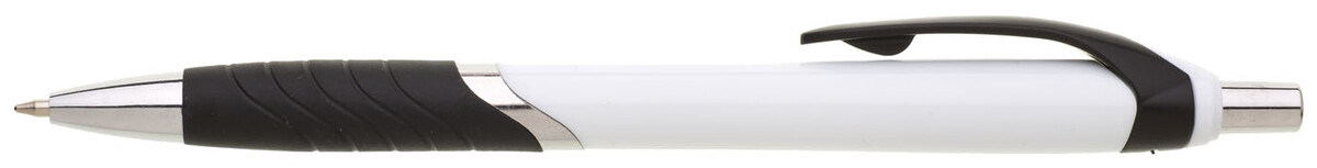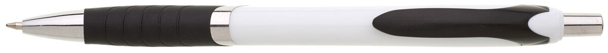 Plastová propiska s bílým tělem s černým úchopem a klipem a stříbrnými doplňky. Černě píšící.