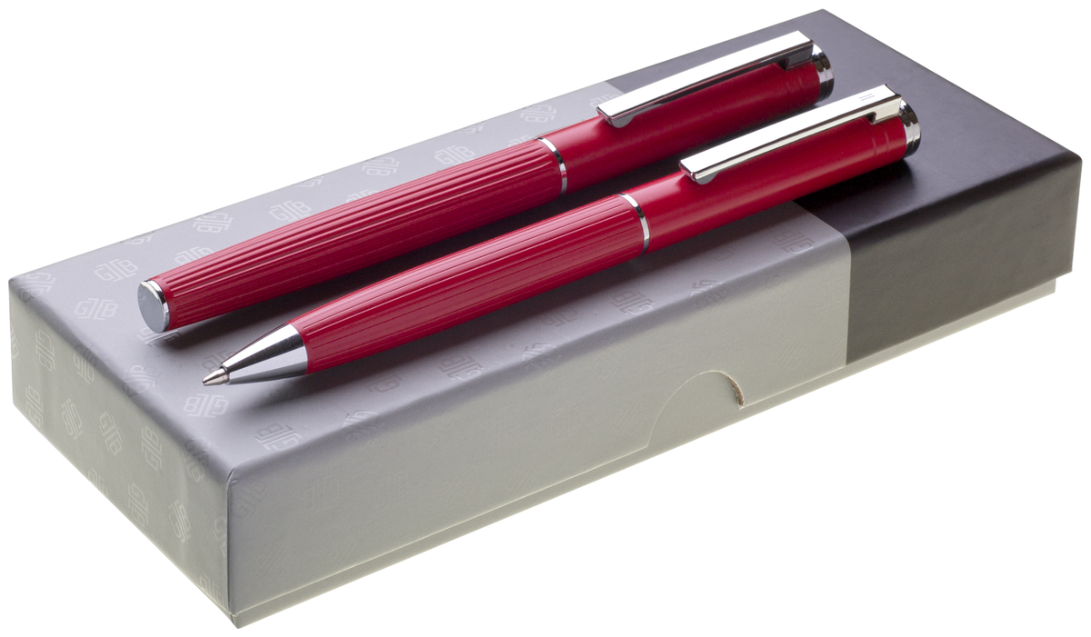 Dárková sada s červenou propiskou a rollerem v dárkové papírové krabičce. Laser na propiskách je lesklý stříbrný. Kolekce GB.