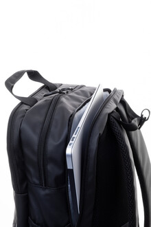 Vodotěsný batoh RPET se 2 přihrádkami na zip, 2 předními kapsami na zip, bočními kapsami a polstrovanou přihrádkou na notebook (16"). S popruhem na vozík, polstrovanými zády a ramenními popruhy. Polyester 600D RPET potažený PU, s výrazným štítkem RPET.