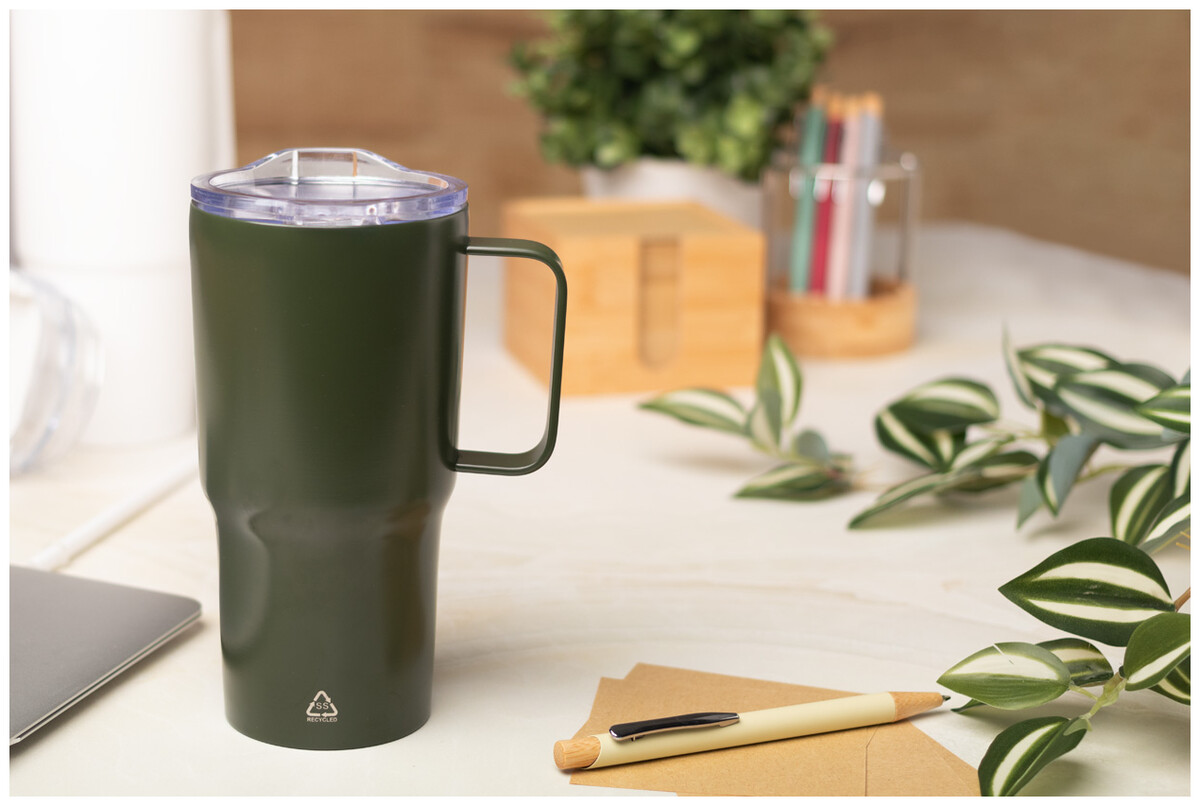 Dvoustěnný vakuově izolovaný termo hrnek z recyklované nerezové oceli s plastovým víčkem na pití z PS. 600 ml.
