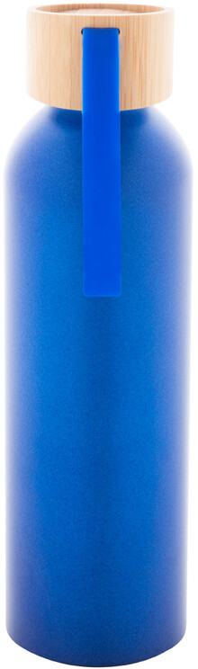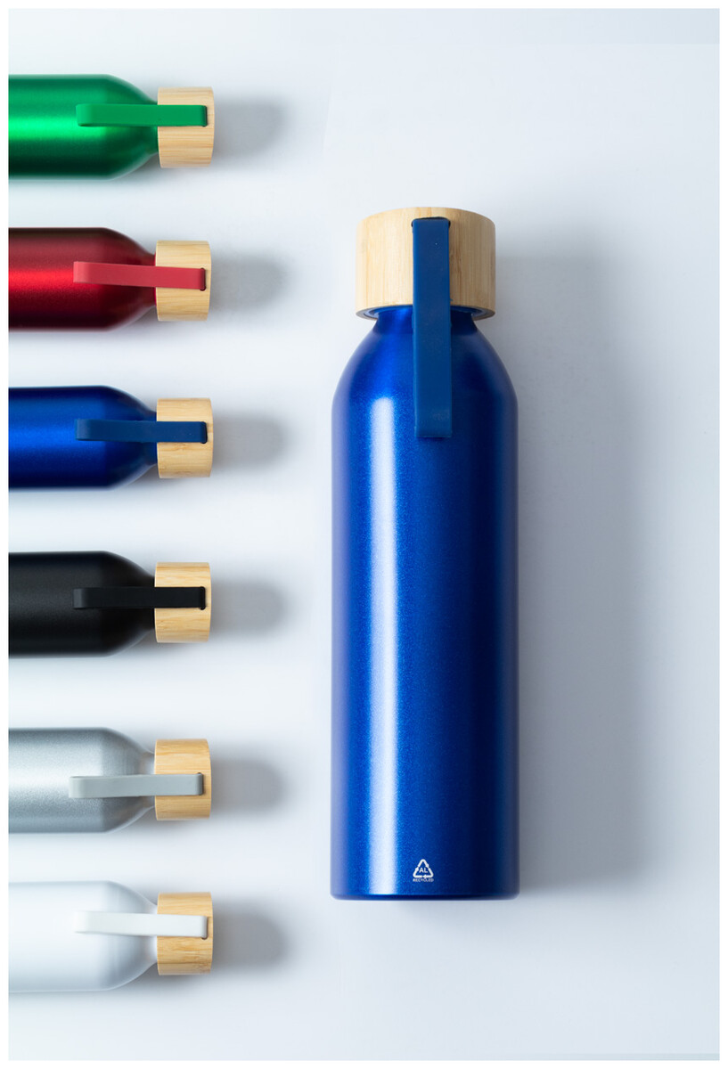 Láhev z recyklovaného hliníku s bambusovým víčkem a silikonovým popruhem v odpovídající barvě, 600 ml.