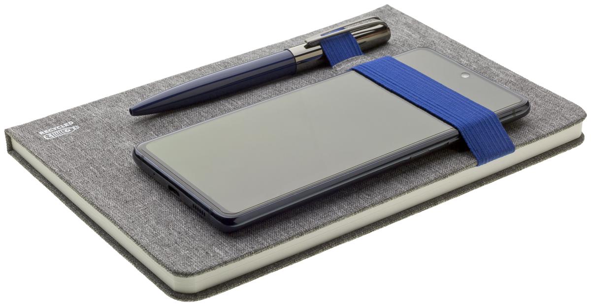 Poznámkový zápisník A5 v deskách z modrého RPET má 80 linkovaných listů. Blok má poutko na propisku a také na mobilní telefon.