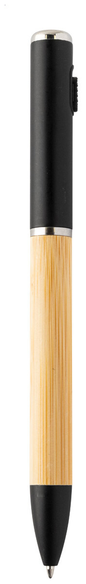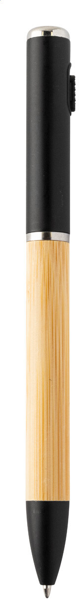 Kuličkové pero z bambusu a recyklovaného ABS plastu s 1 LED svítilnou. S modrou náplní a knoflíkovou baterií.