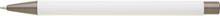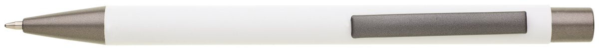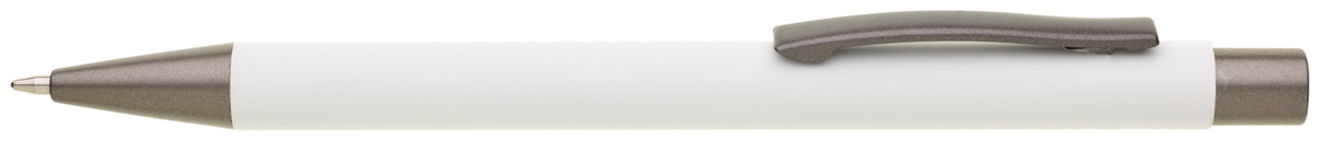 Kovová propiska CAGERI SOFT s hnědo-černými doplňky, s bílým pogumovaným povrchem. Velkoobsahová modrá náplň. Na bílém povrchu propisky jsou místy drobné tečky.