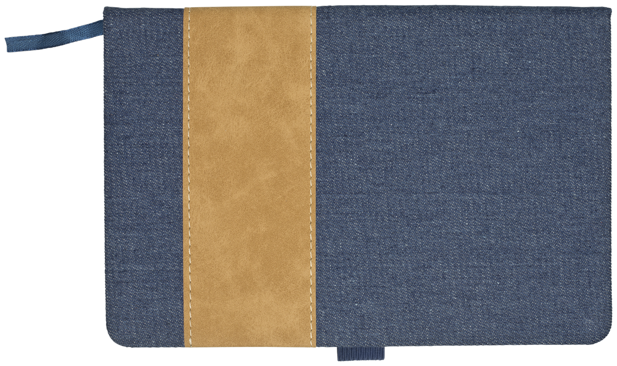 Poznámkový zápisník A5 v deskách v kombinaci tmavě modré denimové látky a PU kůže má 80 linkovaných listů z krémového papíru o hmotnosti 70 g/m2. Blok má poutko na propisku a textilní záložku v modré barvě.