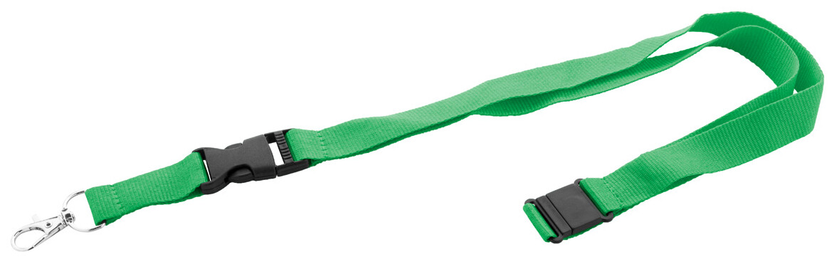 Polyesterový lanyard RPET s odnímatelnou kovovou karabinou a bezpečnostní přezkou.