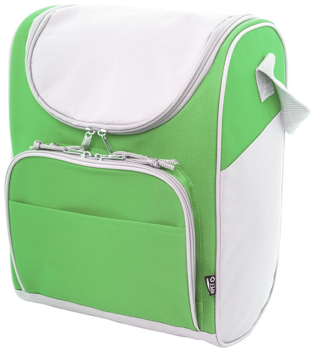 Chladicí taška RPET s hliníkovým polstrováním. Se 2 přihrádkami na zip, malou přední kapsou a nastavitelným ramenním popruhem. 600D RPET polyester s výrazným štítkem RPET.