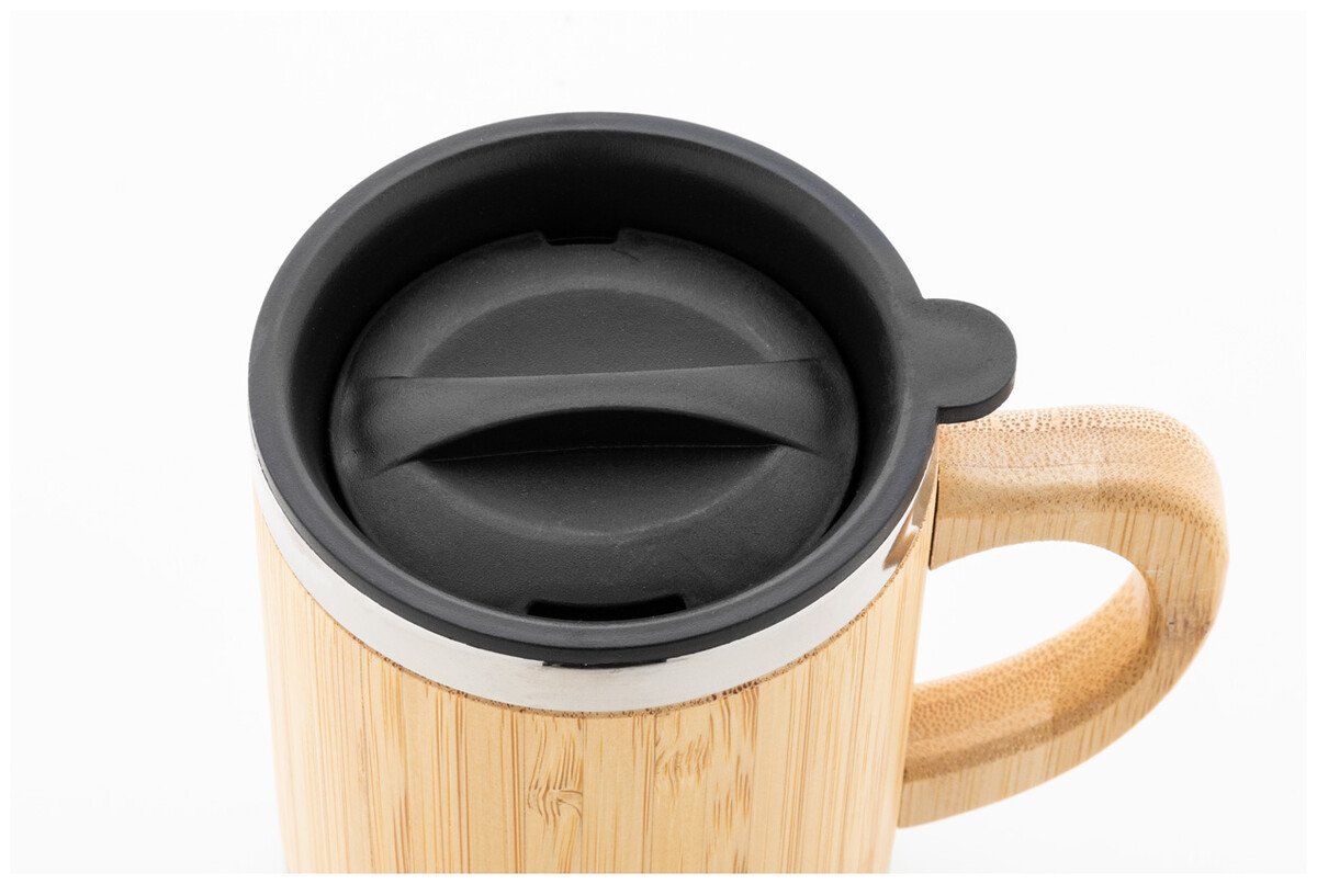 Bambusem potažený, dvoustěnný recyklovaný nerezový izolovaný termo hrnek s bambusovým uchem a PP víčkem na pití, 300 ml.