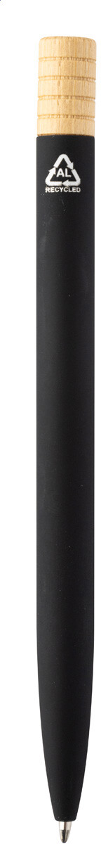 Kuličkové pero z recyklovaného hliníku s kovovým klipem a bambusovým vrškem. S modrou náplní. V kraftové papírové krabičce.