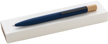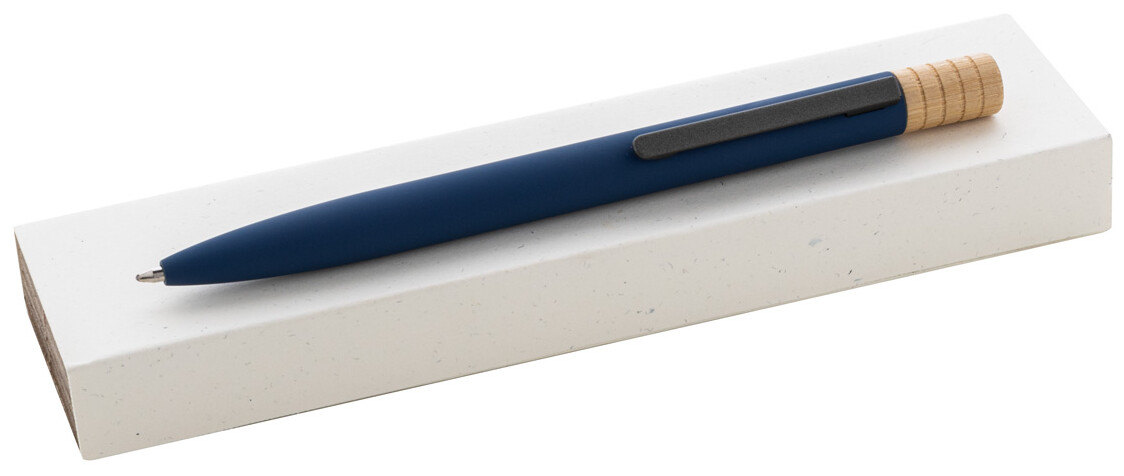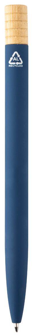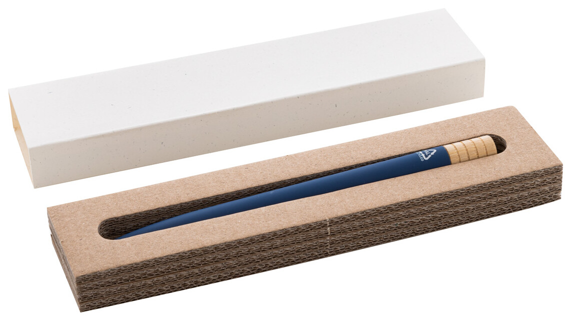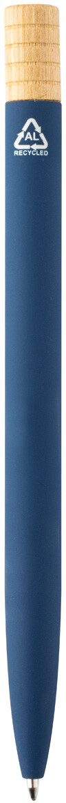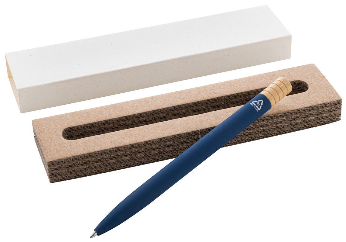 Kuličkové pero z recyklovaného hliníku s kovovým klipem a bambusovým vrškem. S modrou náplní. V kraftové papírové krabičce.