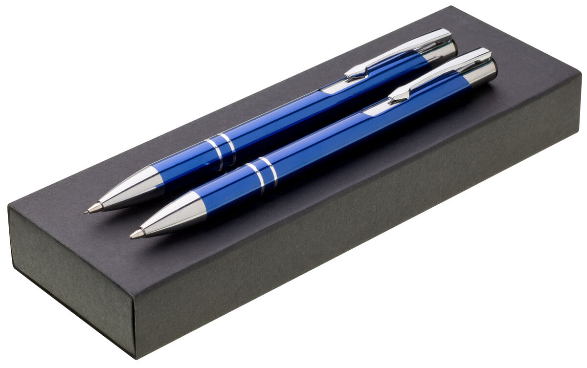 Sada ORIN tmavě modrá, tužky jsou vyrobeny z hliníku, na těle mají 2 stříbrné proužky a doplňky. Dodávají se v papírové krabičce.