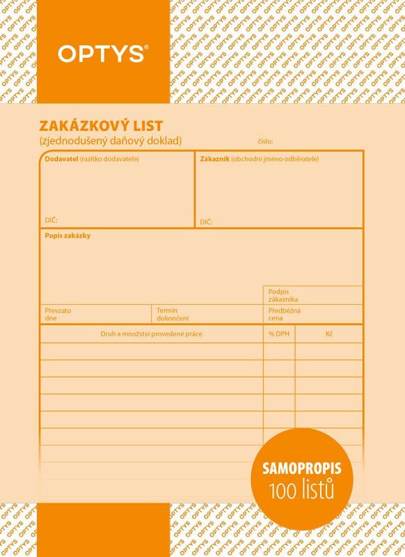 | 25240401 | Zakázkový list OPTYS A5, samopropisovací, 100 listů | 133,76 Kč | 161,85 Kč | 1 ks | |||