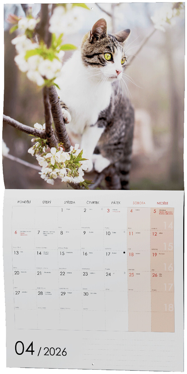 - poznámkové kalendárium se státními svátky, měsíční fáze, roční období, letní a zimní čas, místo na poznámky, kočičí jména