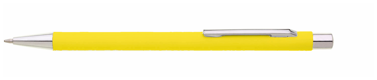 Tenká, jednoduchá propiska s žlutým pogumovaným tělem a chromovými doplňky. Náplň X20, modře píšící.