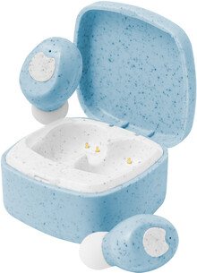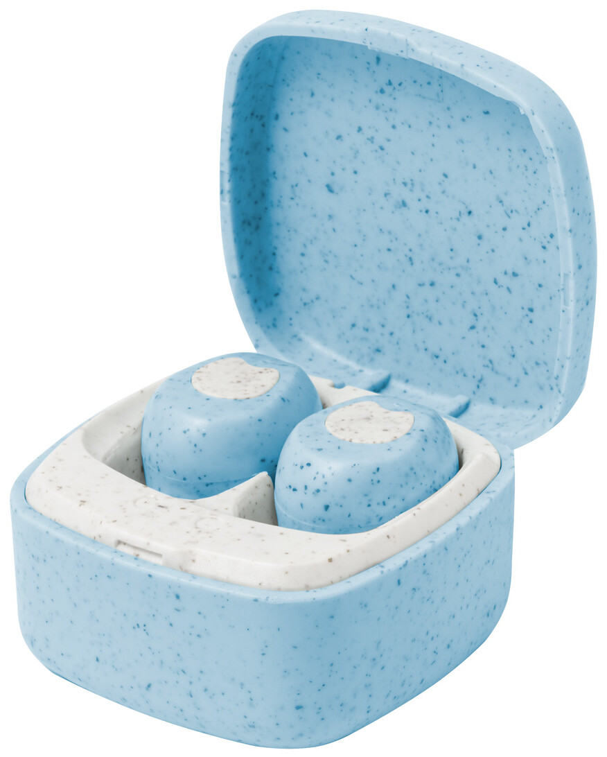 Ekologická plastová sluchátka s pšeničnou slámou, skutečně bezdrátová stereofonní sluchátka (TWS) s funkcí handsfree volání v nabíjecím pouzdře. Včetně nabíjecího kabelu USB.