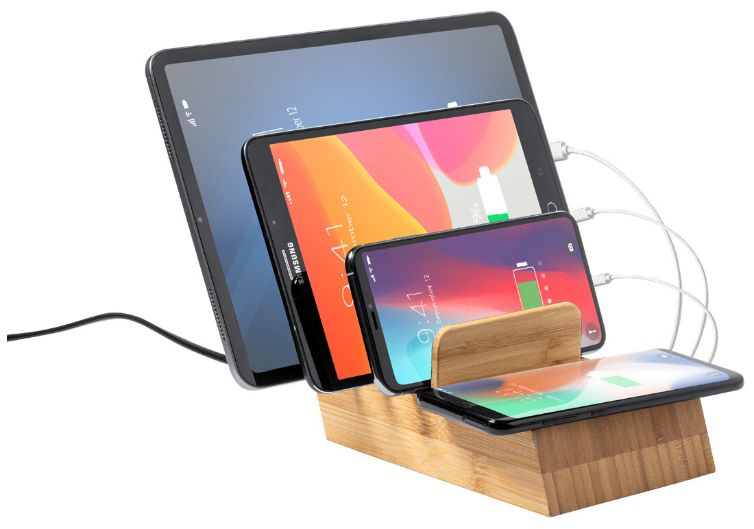 Bambusová USB nabíjecí stanice s držáky na mobil a vestavěnou bezdrátovou rychlonabíječkou. Se 2 porty USB a 1 portem USB-C pro nabíječku. Včetně AC nabíjecího kabelu.