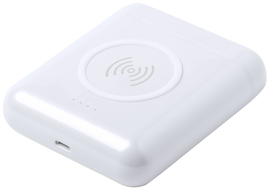 Plastová USB powerbanka s baterií 5000 mAh, vestavěnou bezdrátovou nabíječkou (5 W) a skutečnými bezdrátovými stereofonními sluchátky (TWS) s funkcí hands-free volání. Vstupní port USB-C. Včetně nabíjecího kabelu USB.