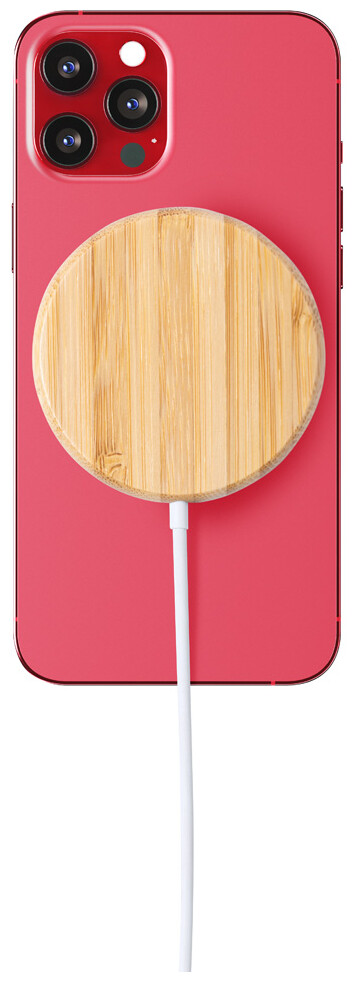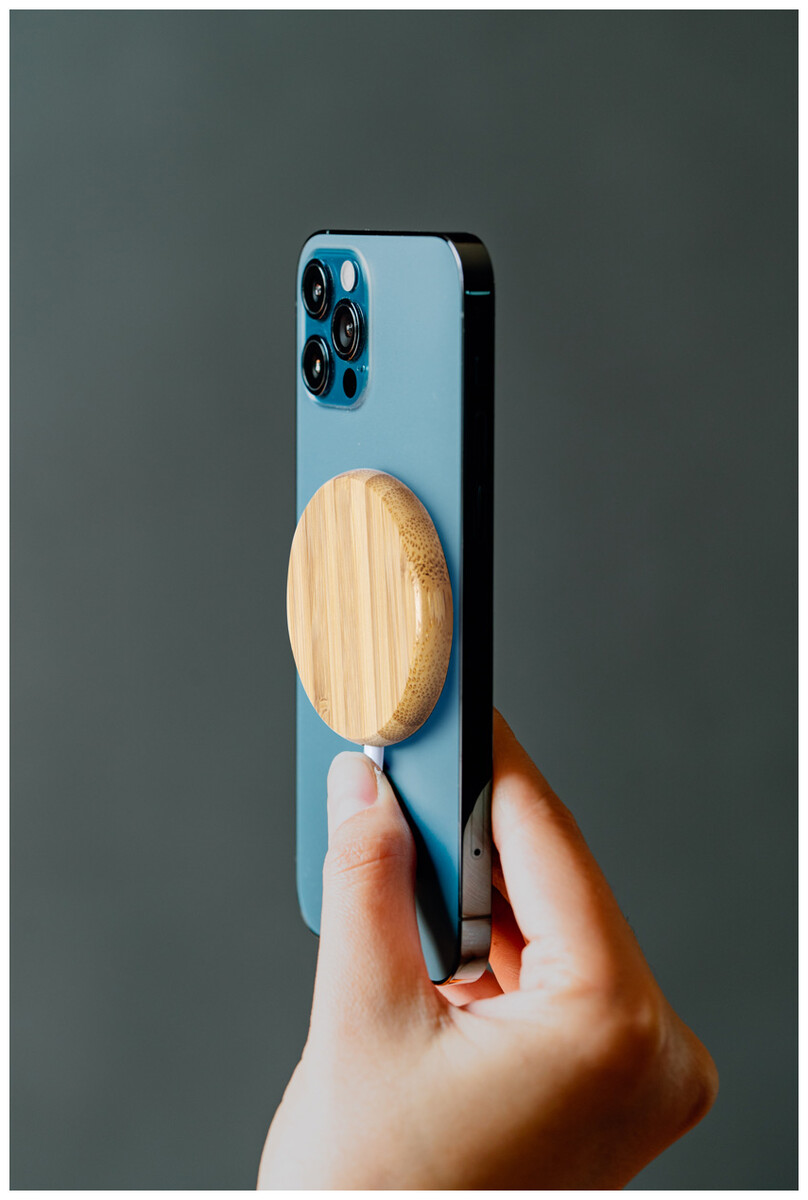 Magnetická bezdrátová rychlá nabíječka (10W) v bambusovém pouzdře s LED kontrolkou nabíjení. Včetně samolepicího kovového kroužku pro použití magnetické funkce na jakémkoli bezdrátově nabíjitelném zařízení. Včetně USB nabíjecího kabelu.