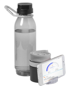 Plastová multifunkční sportovní láhev s chladicím ručníkem (390 g/m2) ve spodní přihrádce a výsuvným držákem na mobilní telefon. V dárkovém balení. Objem 650 ml. Není vhodná pro sycené nápoje.