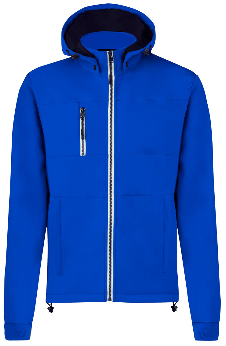 Větru a voděodolná softshellová bunda na zip se 2 bočními kapsami, 1 přední kapsou, stojáčkem a odepínací kapucí. 100% polyester, 300 g/m2.