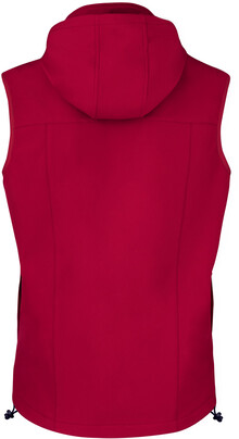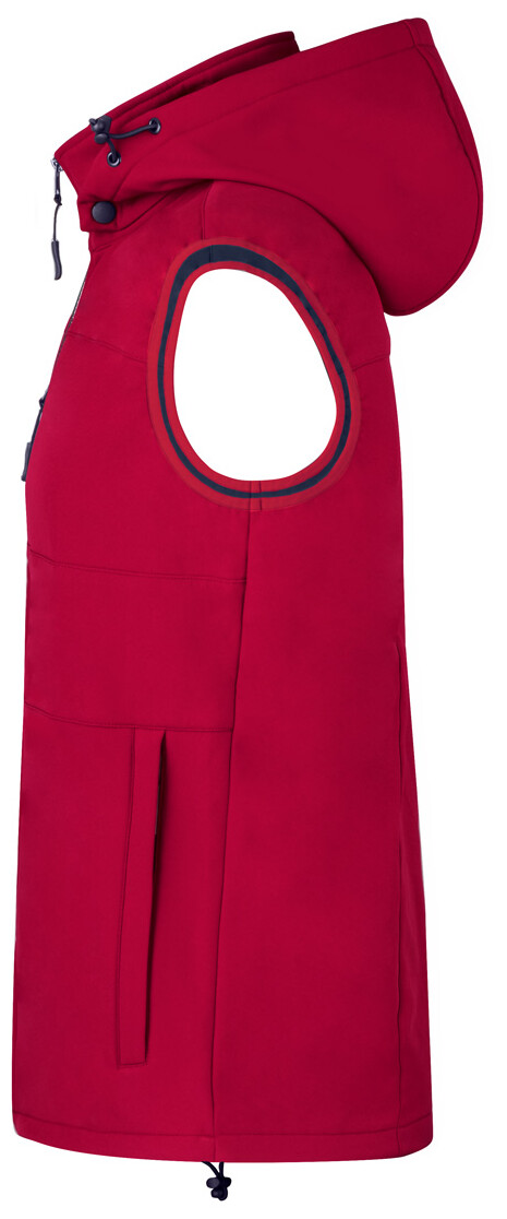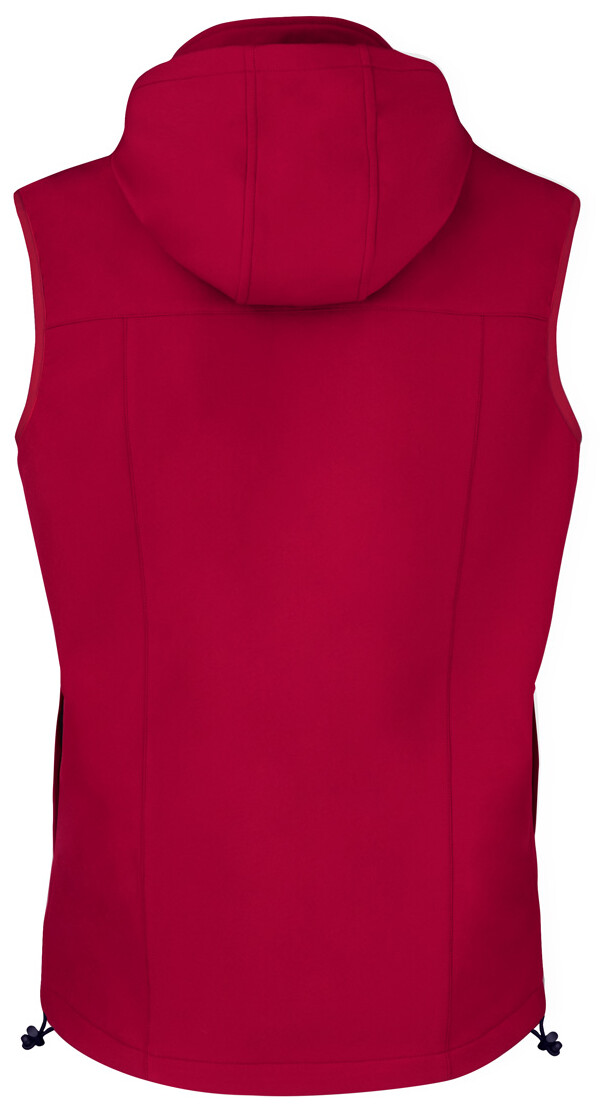 Větru a voděodolná softshellová vesta na zip se 2 bočními kapsami, 1 přední kapsou, stojáčkem a odepínací kapucí. 100% polyester, 300 g/m2.