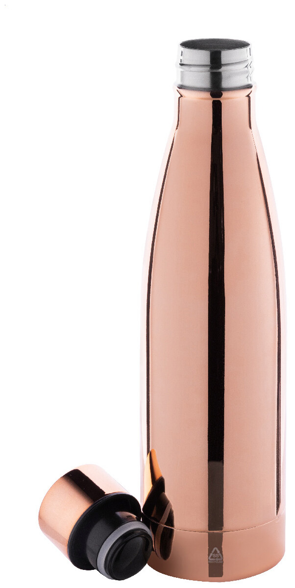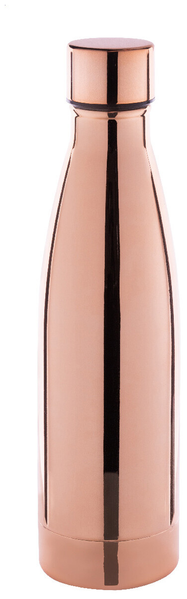 Dvoustěnná vakuově izolovaná měděná láhev s vysoce lesklou kovovou povrchovou úpravou, 500 ml. Měděná izolace udrží nápoje teplé 12 hodin a studené 24 hodin.