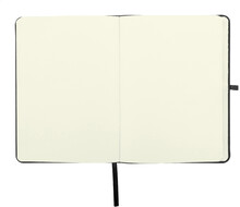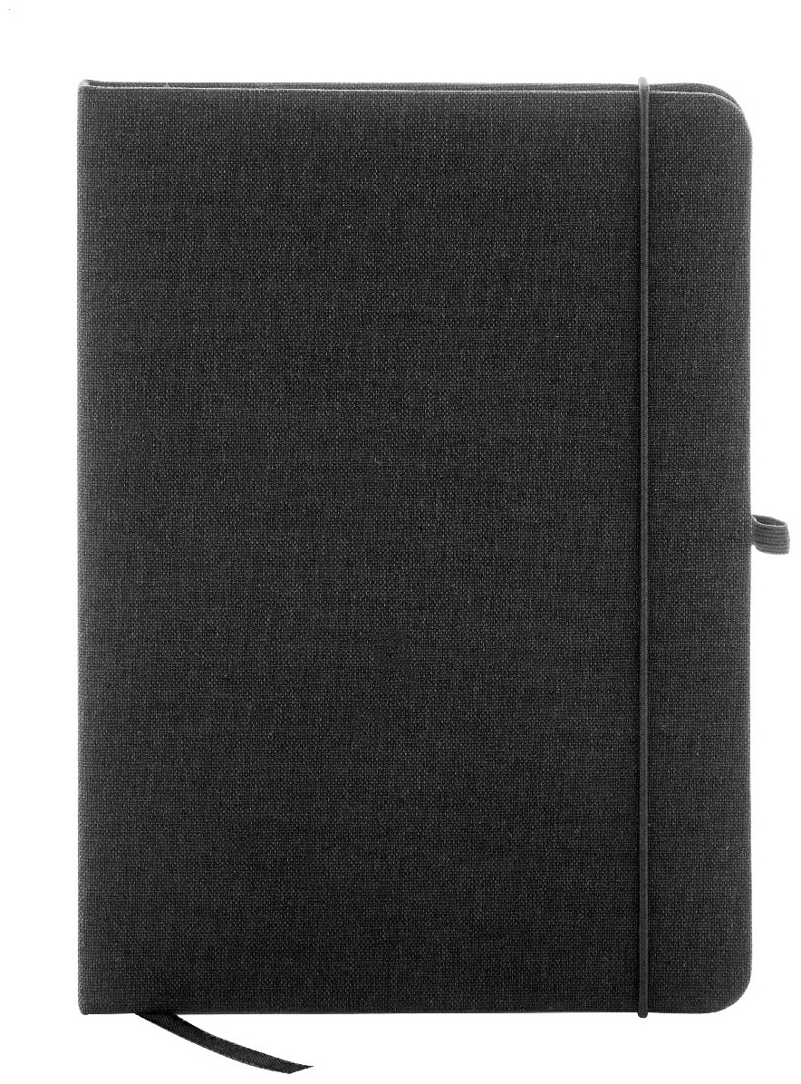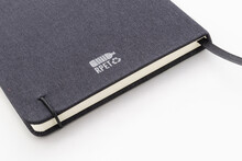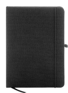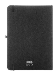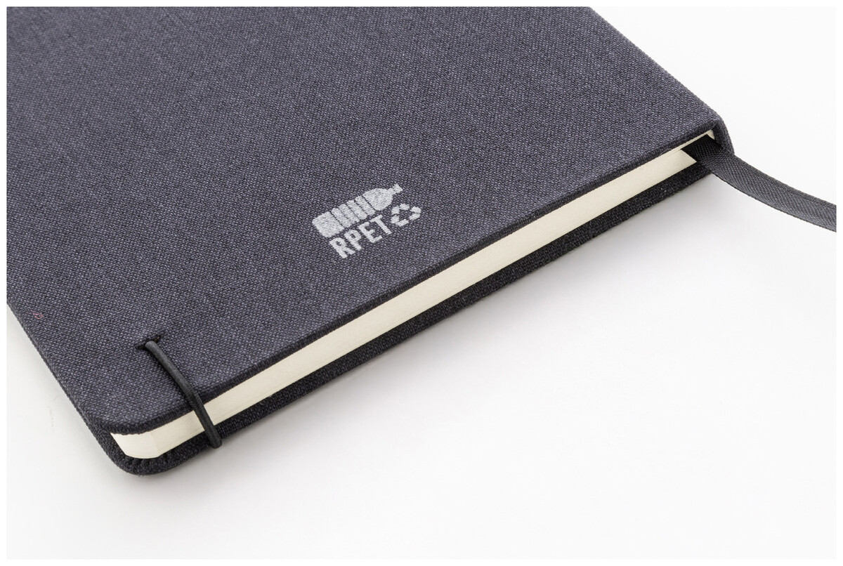 Blok A5 potažený polyesterem 300D RPET s 80 čistými listy. S gumovým páskem, záložkou a držákem na pero.