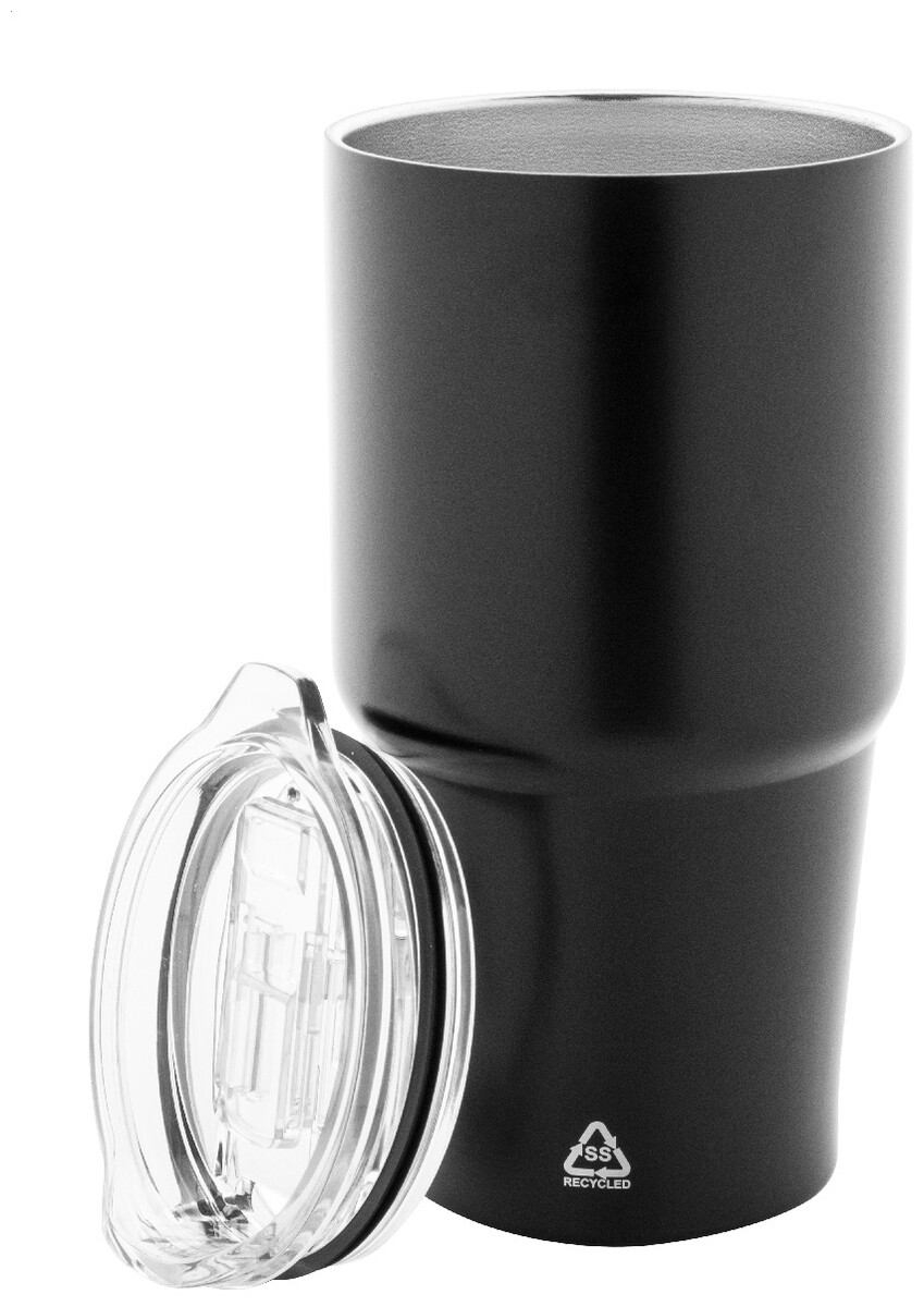 Dvoustěnný vakuově izolovaný termohrnek z recyklované nerezové oceli s víčkem z polystyrenového plastu. 600 ml.