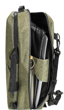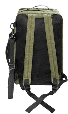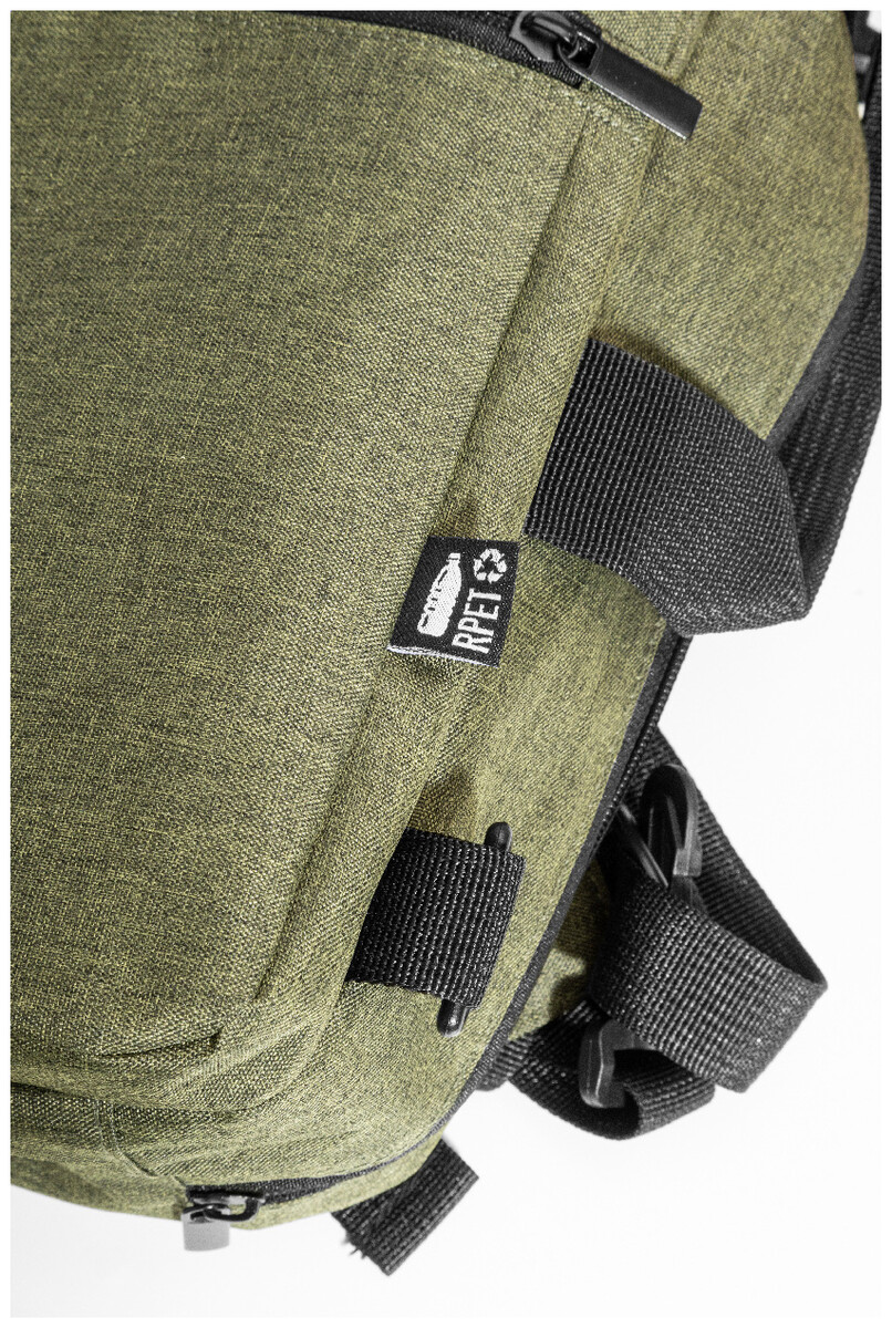 Dvojfunkční RPET batoh a taška na dokumenty s přihrádkou na zip, 2 předními kapsami na zip a polstrovanou přihrádkou na notebook (15"). S polstrovanými zády a ramenními popruhy. Součástí je i odnímatelný ramenní popruh pro použití jako taška na dokumenty. 600D RPET polyester s výrazným štítkem RPET.