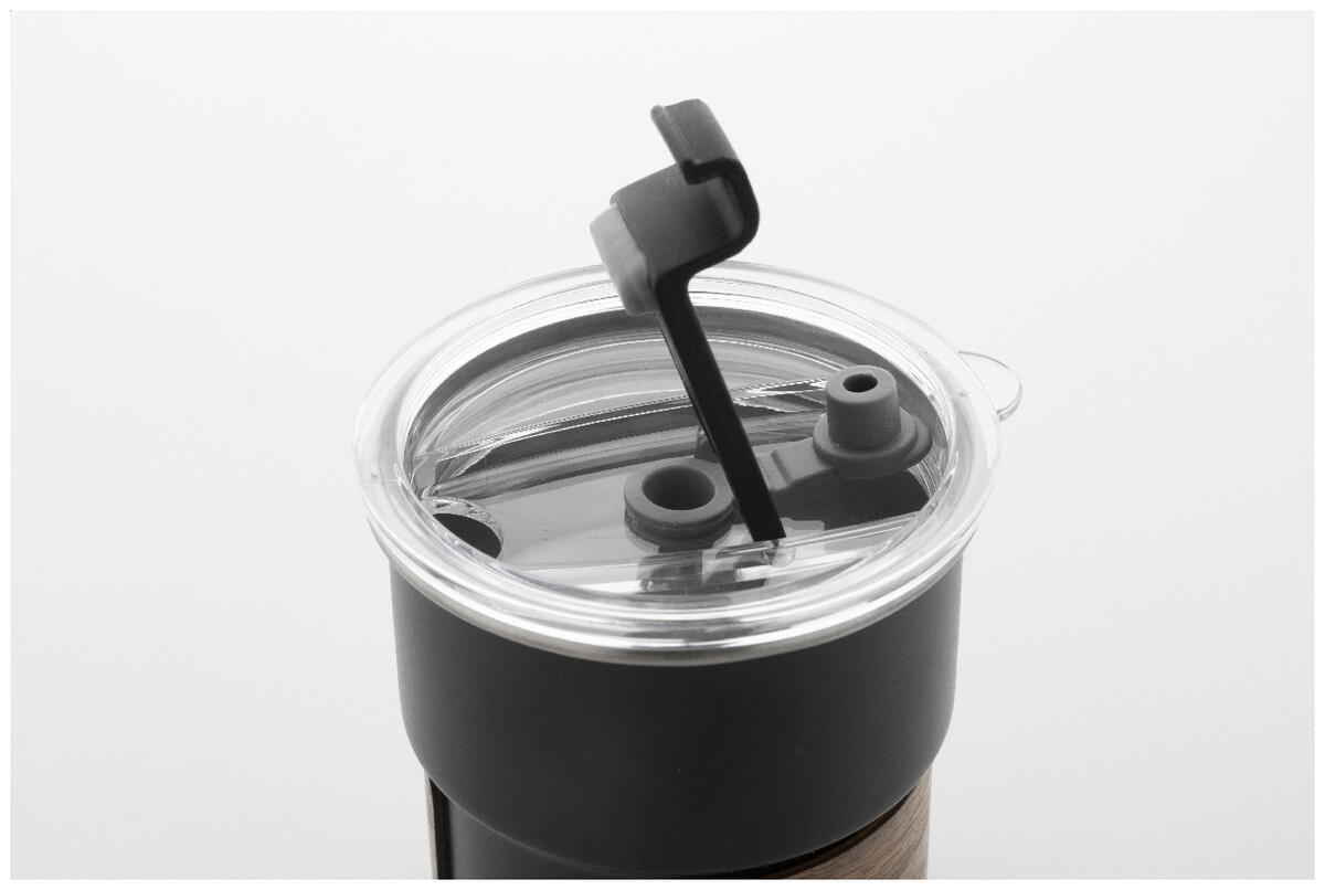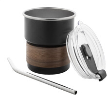 Jednostěnný cestovní hrnek z recyklované nerezové oceli s úchopem z ořechového dřeva, plastovým víčkem a brčkem z recyklované nerezové oceli. 260 ml.