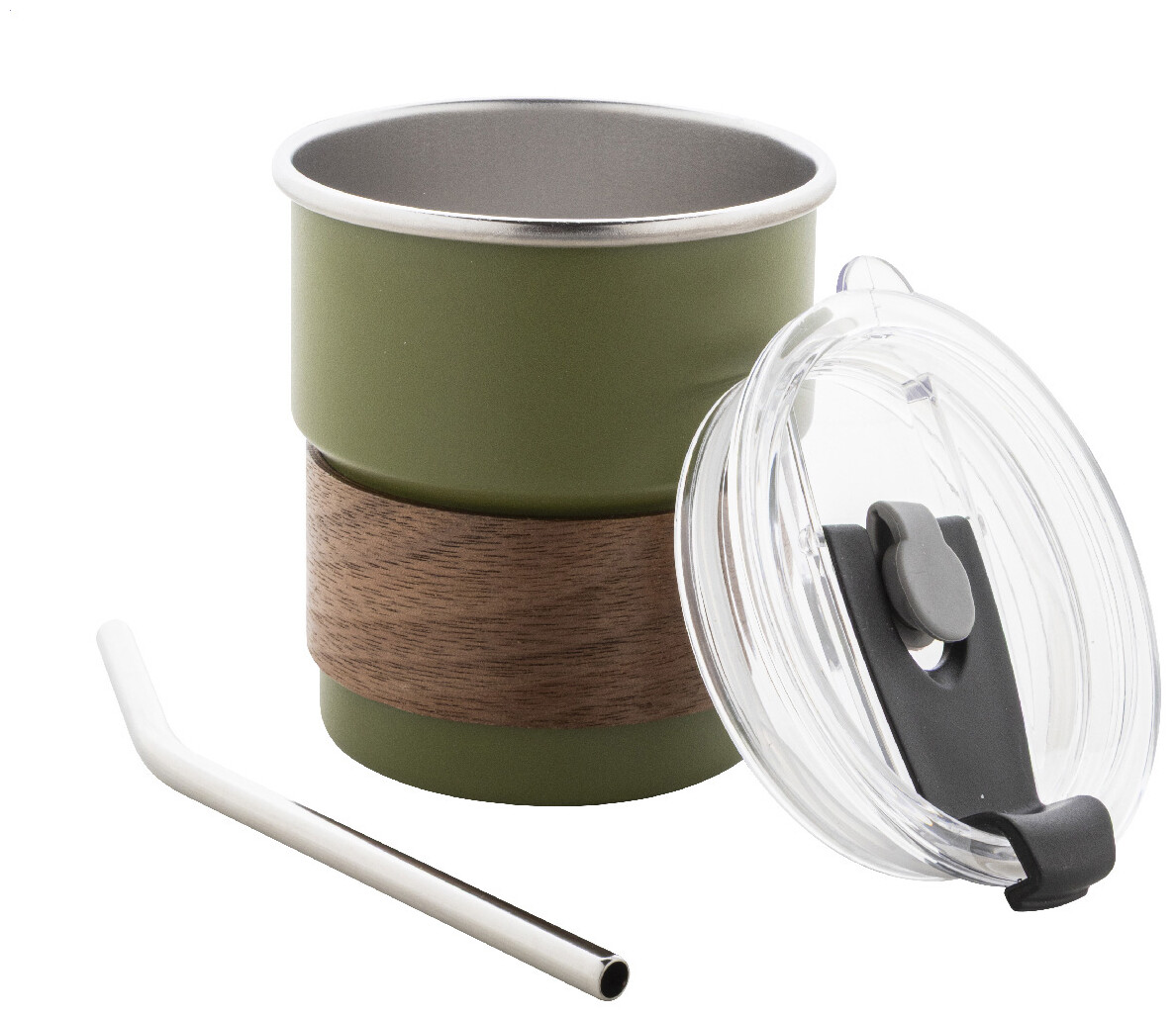 Jednostěnný cestovní hrnek z recyklované nerezové oceli s úchopem z ořechového dřeva, plastovým víčkem a brčkem z recyklované nerezové oceli. 260 ml.