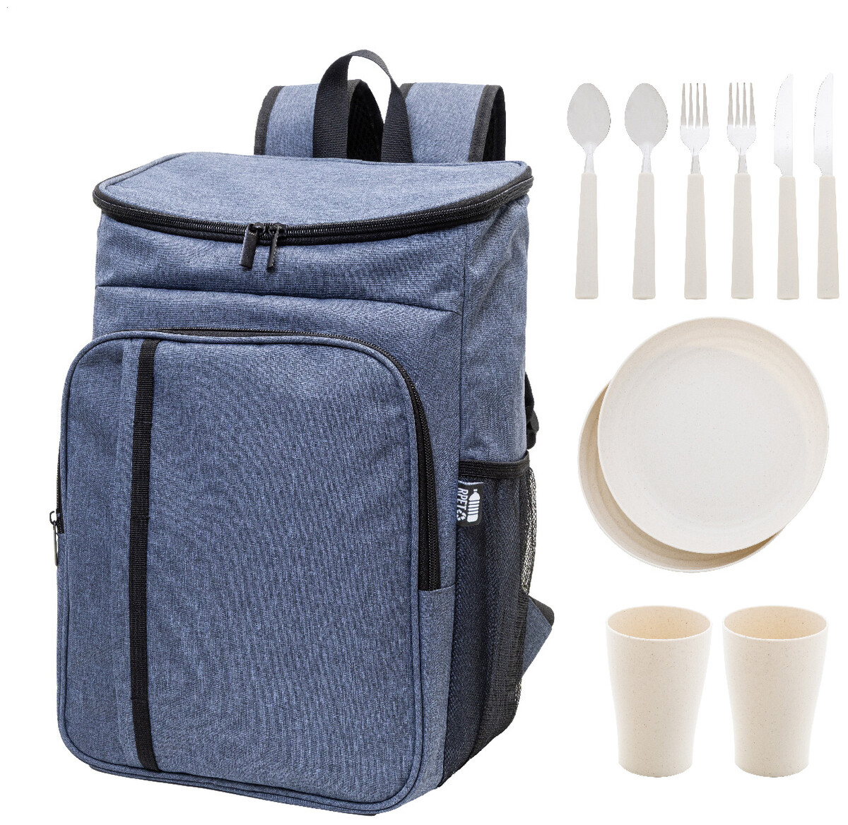 Chladicí piknikový batoh z RPET s přední kapsou na zip a chladicí přihrádkou na zip s PEVA výplní. S bočními síťovanými kapsami, polstrovanými zády a ramenními popruhy. Včetně nádobí z PP a nerezové oceli pro 2 osoby: 2 talíře, 2 hrnky, 2 vidličky, 2 lžíce a 2 nože. 600D RPET polyester s výrazným štítkem RPET.
