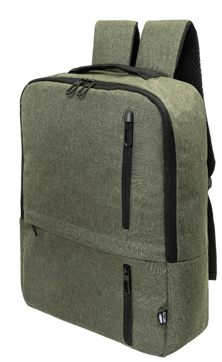 RPET batoh s hlavní přihrádkou na zip a 3 předními kapsami na zip. S polstrovanými přihrádkami na tablet (10") a notebook (15"), polstrovanými zády a ramenními popruhy. 600D RPET polyester s výrazným štítkem RPET.