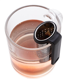 Nerezové sítko na čaj s praktickým klipem z recyklovaného ABS plastu. Navržen pro snadné připevnění k okraji hrnku.