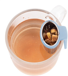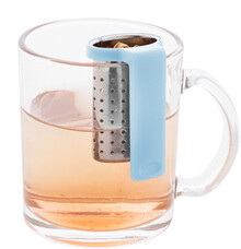 Nerezové sítko na čaj s praktickým klipem z recyklovaného ABS plastu. Navržen pro snadné připevnění k okraji hrnku.
