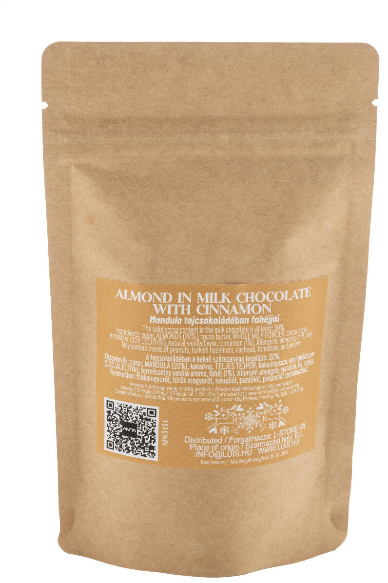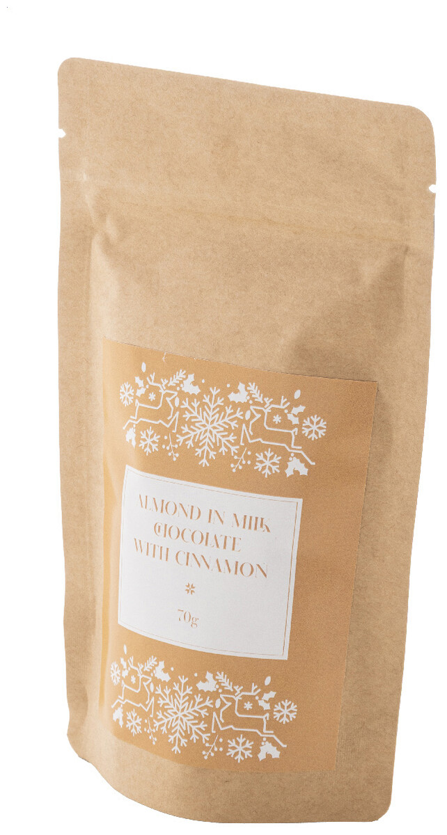 Mandle obalené mléčnou čokoládou a skořicí v přírodním kraftovém papírovém sáčku. 70 gramů.