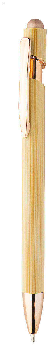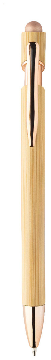Bambusové dotykové kuličkové pero s lesklými kovovými detaily a barevným dotykovým stylusem. S modrou náplní.