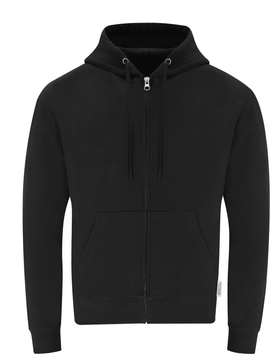 Mikina s kapucí na zip a předními kapsami ze 60% organické bavlny a 40% RPET polyesteru, 280 g/m2.