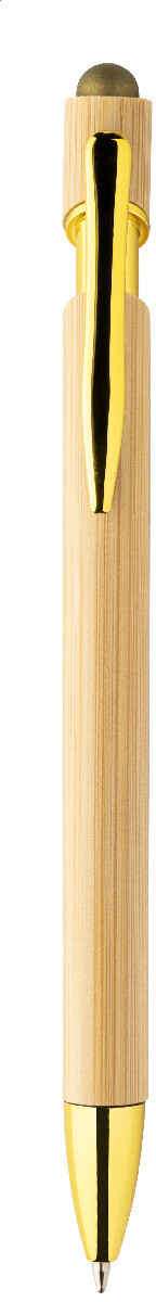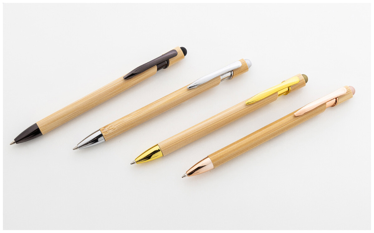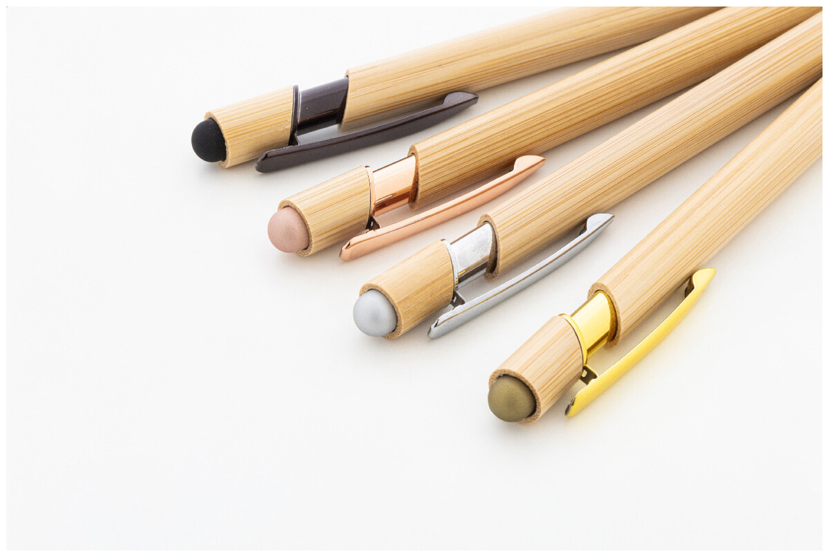 Bambusové dotykové kuličkové pero s lesklými kovovými detaily a barevným dotykovým stylusem. S modrou náplní.