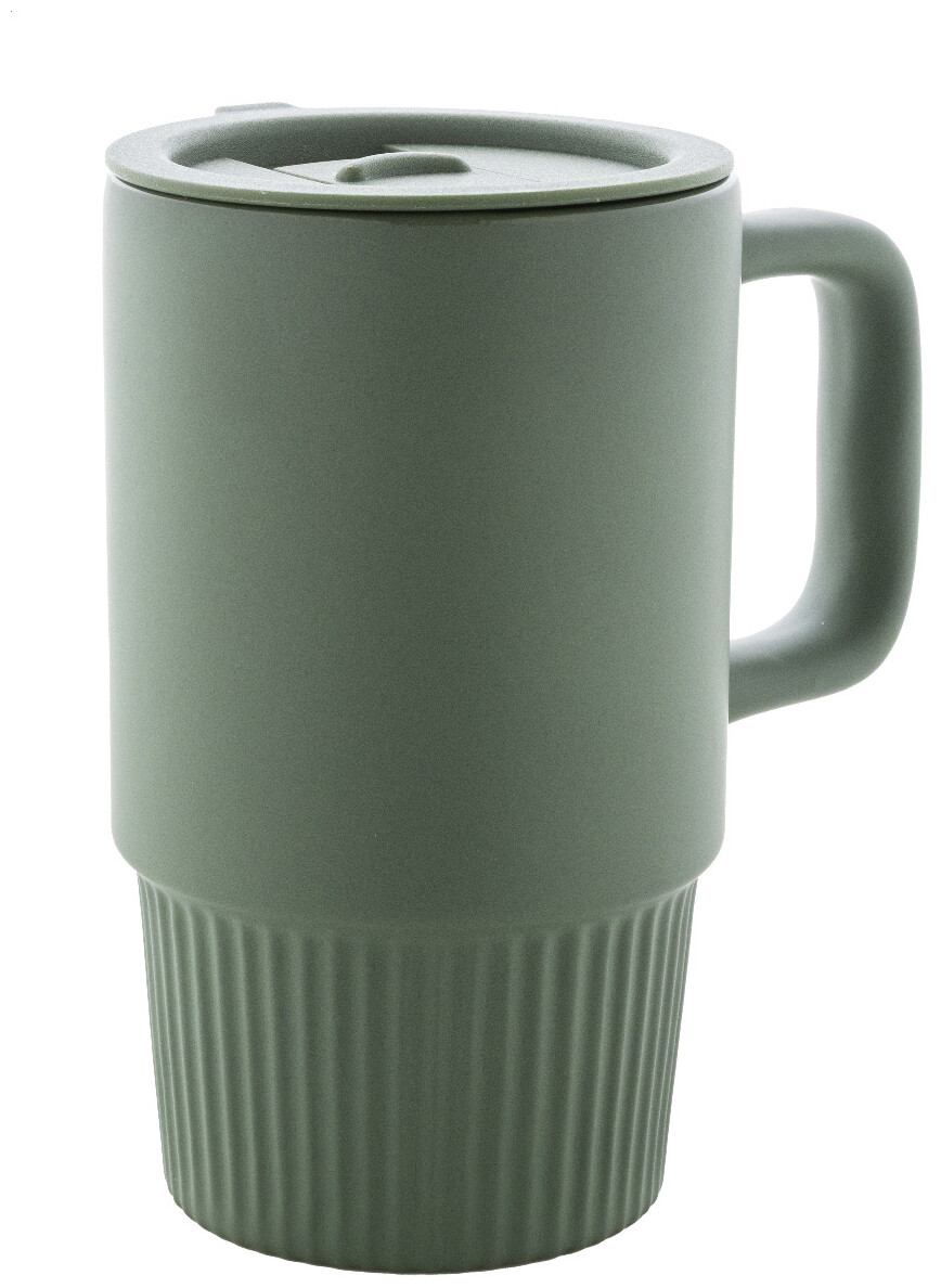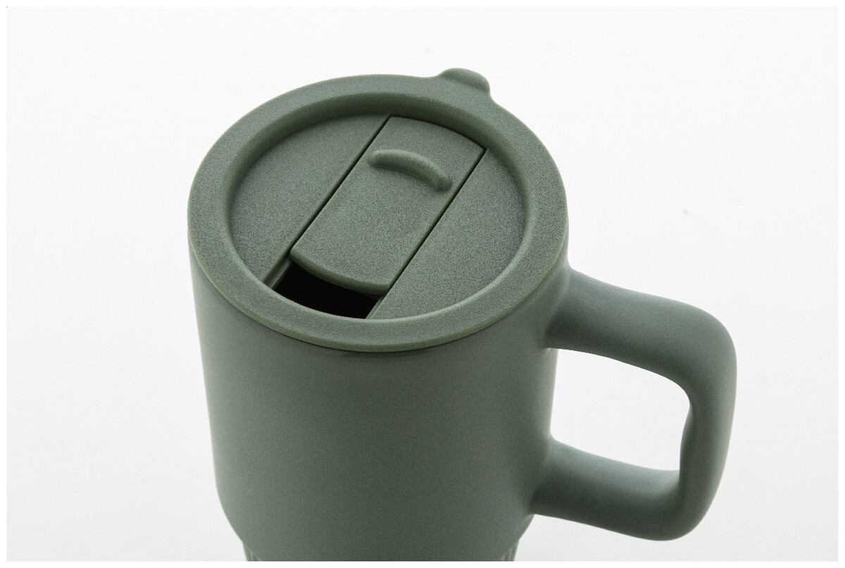 Vysoce kvalitní keramický cestovní hrnek s matným vnějším povrchem a plastovým víčkem z polypropylenu. 420 ml.