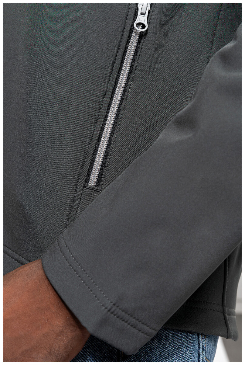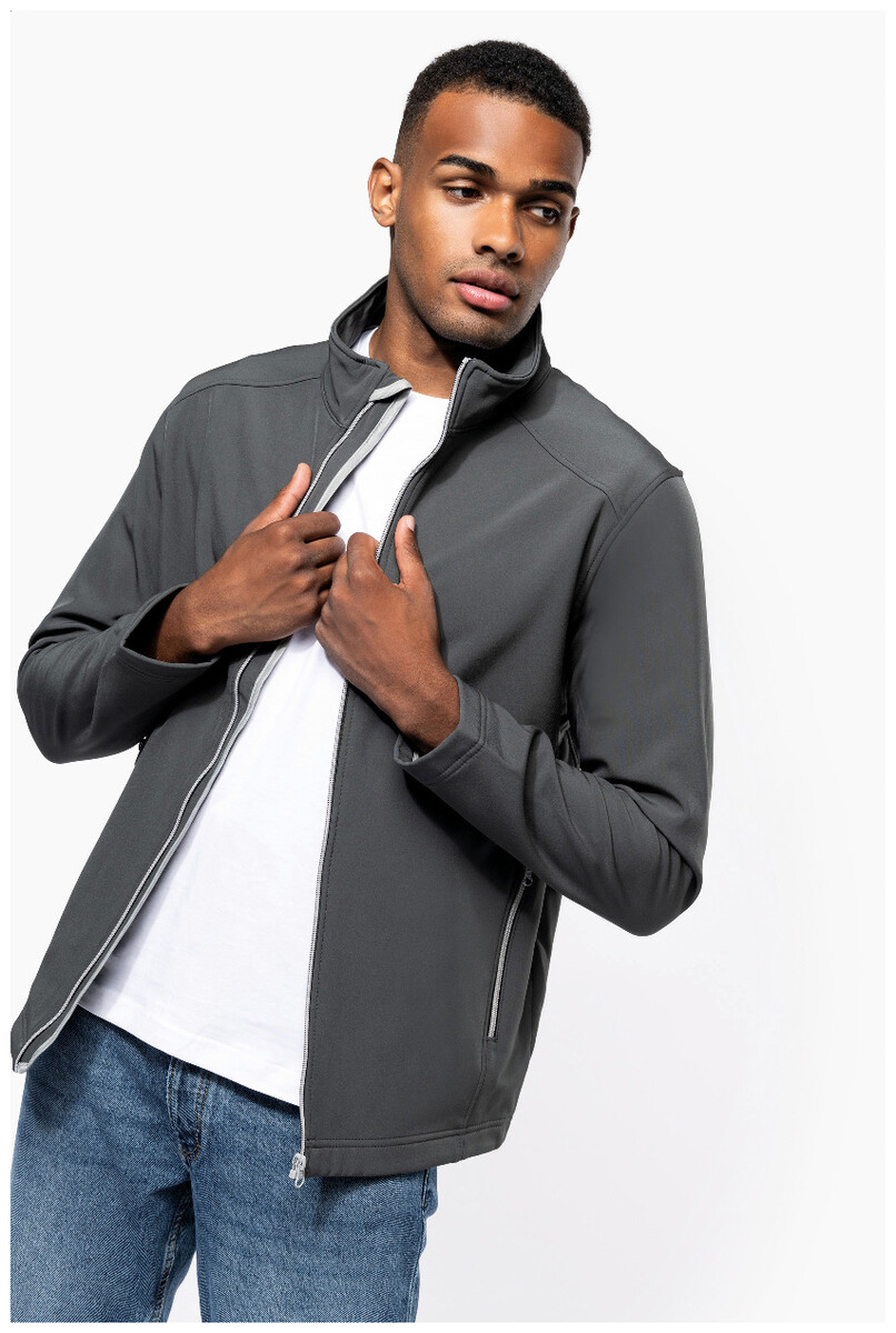 Dvouvrstvá softshellová bunda na zip s bočními kapsami na zip. S kontrastními zipy. Vodoodpudivá tkanina. Vnější strana: 95 % polyester a 5 % elastan. Vnitřní strana: 100% polyester micro polar fleece. Materiál: 300 g/m2. Výrobek značky Kariban.