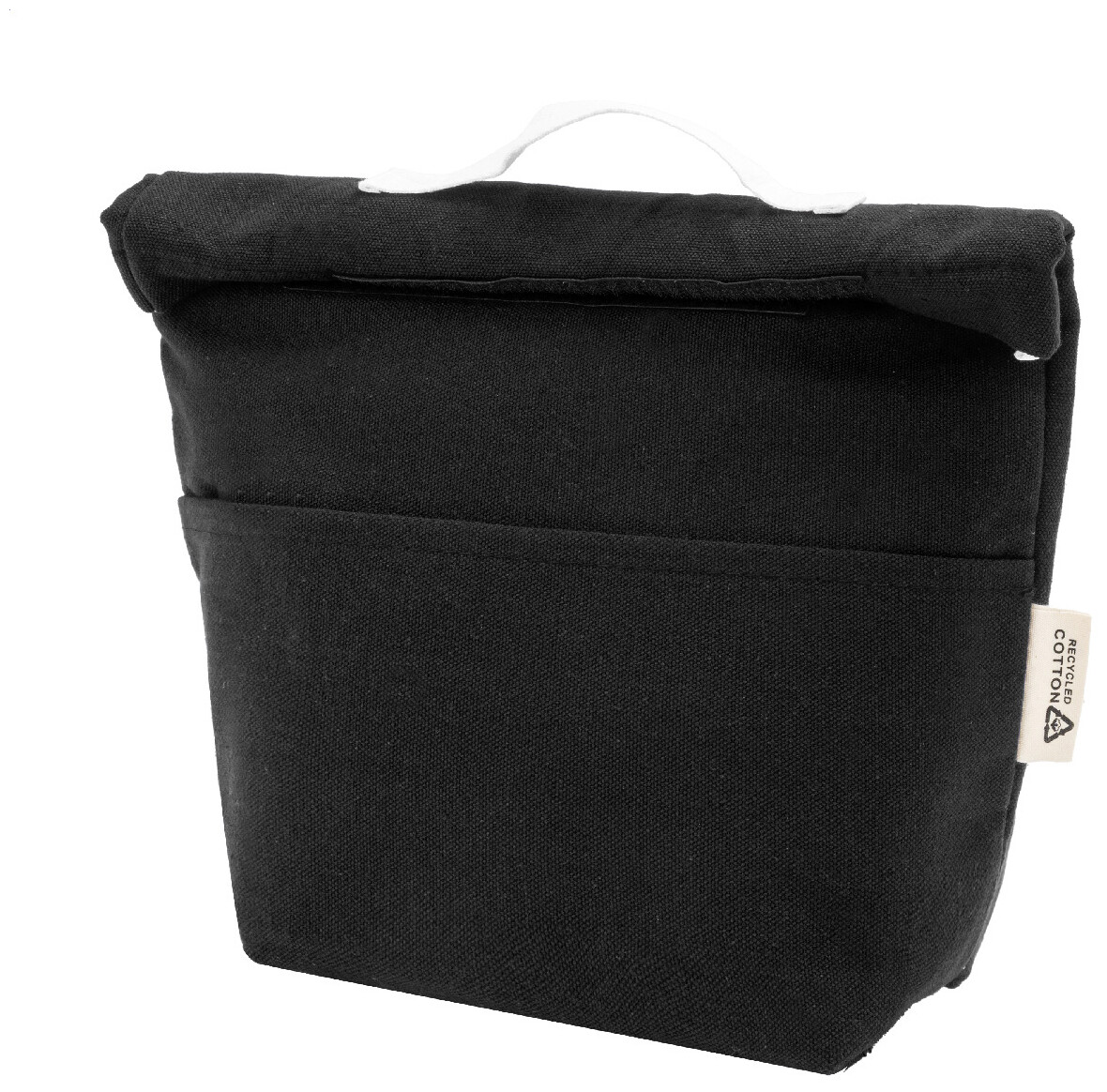 Chladicí taška z recyklovaného plátna s rolovacím vrškem, přední kapsou, hliníkovou výplní a zapínáním na suchý zip. 70 % recyklované bavlny a 30 % RPET polyesteru. S výrazným štítkem recyklované bavlny.