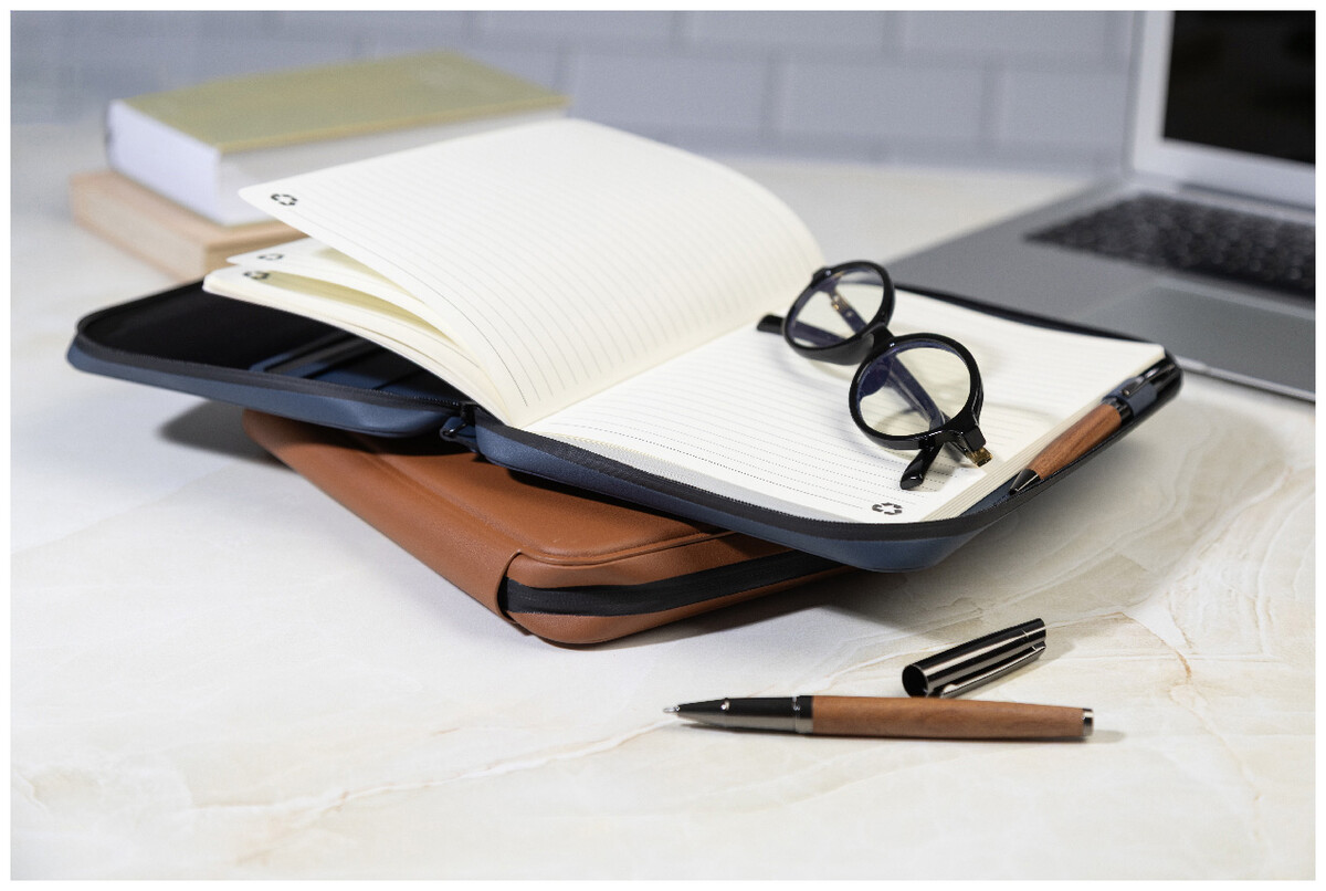Luxusní složka na dokumenty A5 na zip z recyklované umělé kůže s 64 linkovanými listy a blokem z recyklovaného papíru. S několika vnitřními kapsami na karty a dokumenty.