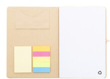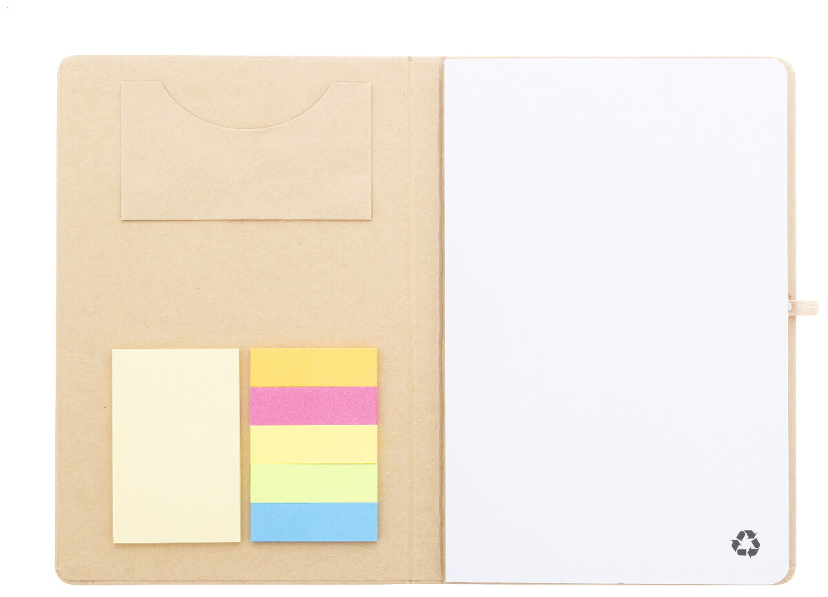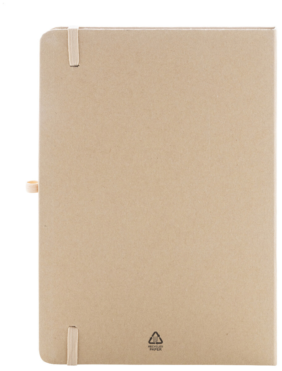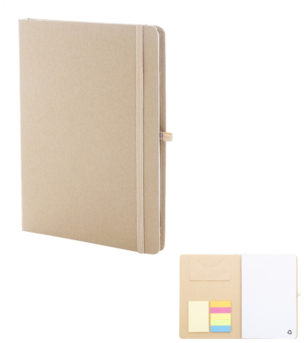 Blok A5 z recyklovaného kartonu s 70 prázdnými listy z recyklovaného papíru. Vnitřní obal obsahuje 25 samolepících papírků, 125 značkovačů stránek a kapsu na vizitky. S gumovým popruhem a držákem na pero.
