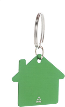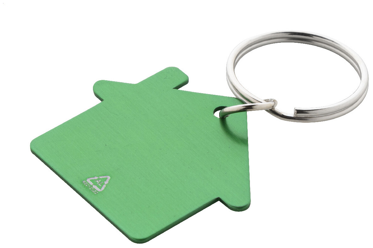 Přívěšek na klíče ve tvaru domečku z recyklovaného hliníku s kovovým kroužkem.