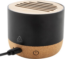 Bezdrátový reproduktor v pouzdře z recyklovaného hliníku s bambusovou síťovinou a základnou z přírodního korku. S dobíjecí baterií (400 mAh). Včetně nabíjecího kabelu USB.