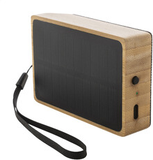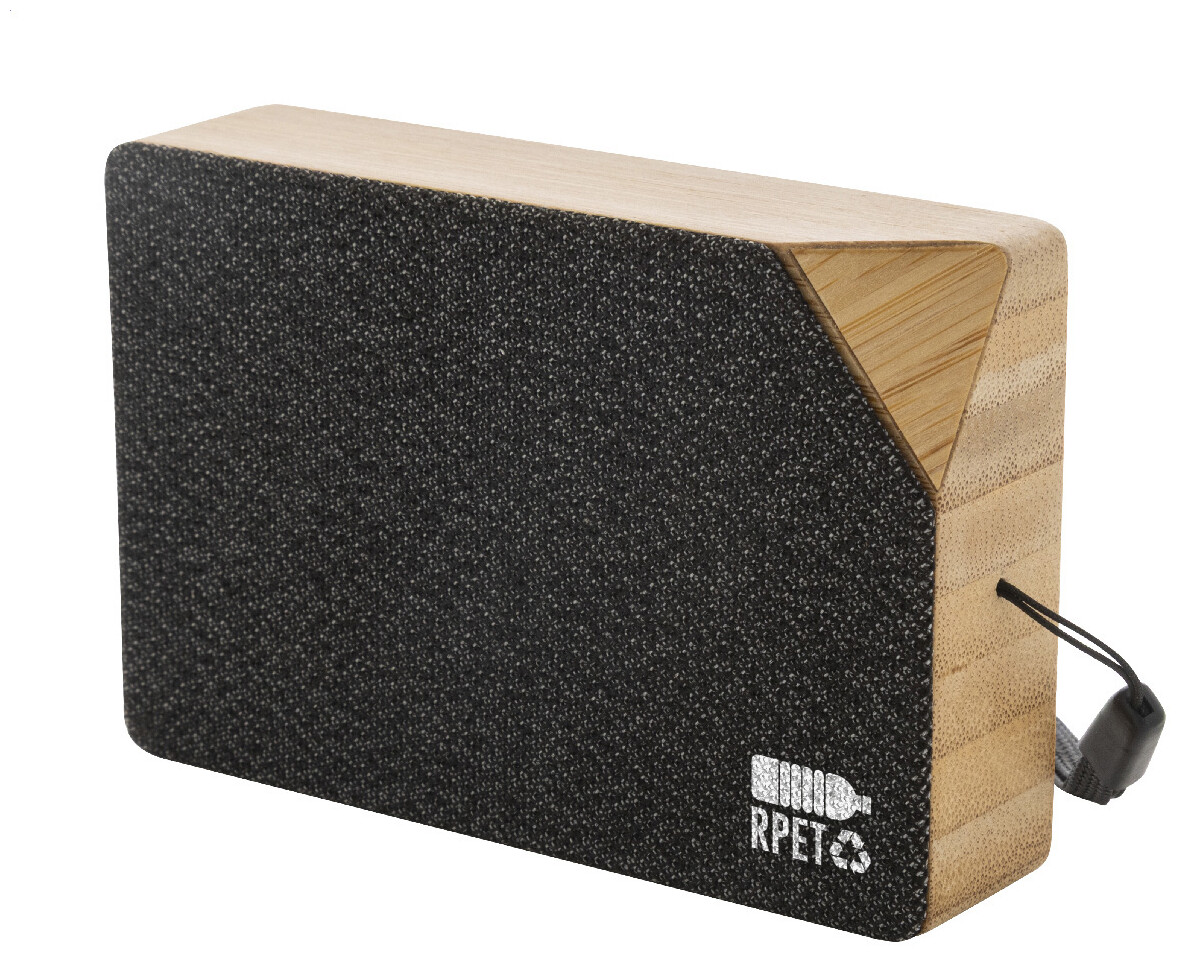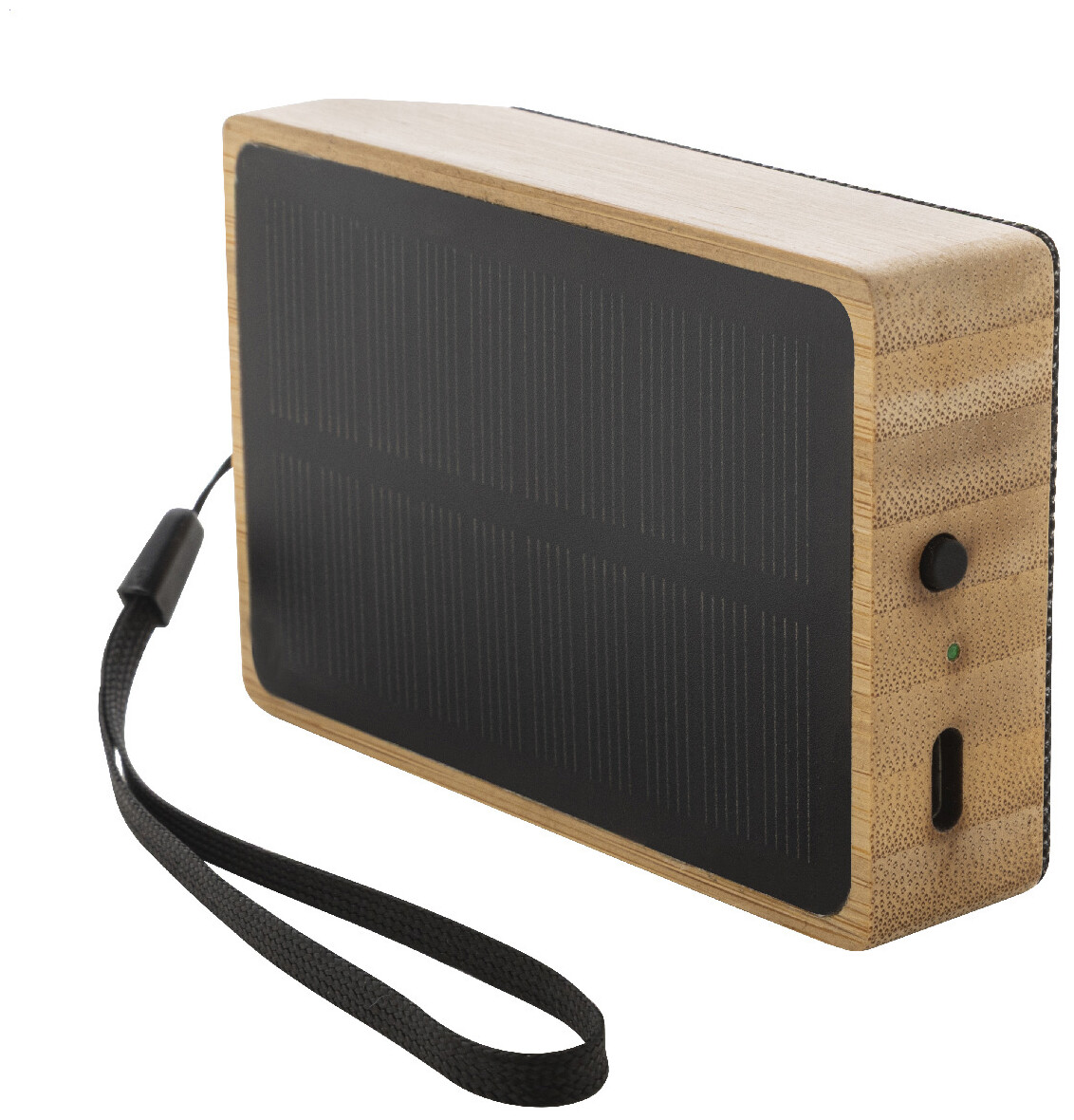 Bezdrátový reproduktor z bambusu s polyesterovou síťovinou RPET, vestavěnou solární nabíječkou, popruhem na nošení a dobíjecí baterií (300 mAh). Včetně nabíjecího kabelu USB.